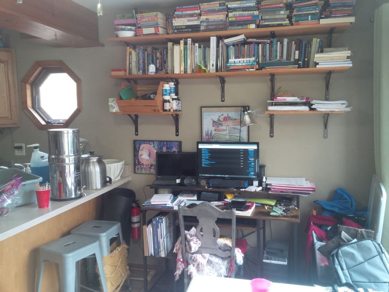 But in general, creatively, my art flagged. In part, practically, my art work demands access to my computer and tablet (if I’m not sketching on paper) and as we relied on the breadwinner now working from home, I needed to relinquish my personal office space to allow for that. I set up a new desk in the kitchen. People walk around talking and interrupting more than usual when your personal space is in a general access of the home. I’m also nearby the door, and the clutter of landing gear happens all around me. The little space must also serve for additional study space and often it’s where guests want to sit down on the shoe storage bench and have a visit. And so I have a kitchen/office/ entryway/ schoolroom/laundry/ storage/ living space.